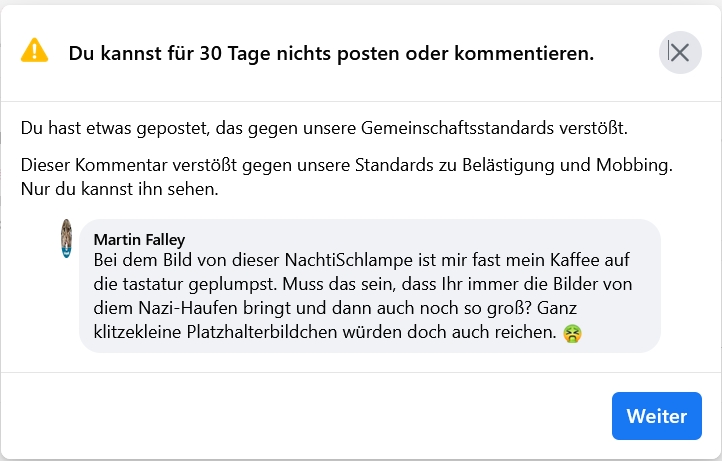 Da ich nun schon mehrfach wegen solcher Nichtigkeiten gesperrt wurde, insbesondere nach notwendigen Abkanzelungen der Nazibande, die sich AfD (dazu werde ich demnächst auch noch meine Meinung schreiben) nennt, sowie deren Mitläufer und Nebenorganisationen aller Couleur, erhebt sich die Frage, ob das Reviewing von facebook nicht doch längst von solchen Leuten unterwandert ist. Zu dieser Einschätzung kommt man, wenn man feststellen muss, dass extremistische und menschenverachtende Beiträge nach einer Meldung an facebook weiterhin stehenbleiben und facebook daran nichts auszusetzen hat. Einzige vorgeschlagene Lösung besteht für facebook darin, solche Beiträge und deren User dauerhaft auszublenden. Das ist aber nicht Sinn der Sache, denn diese Beiträge sind dann weiterhin für andere User sichtbar und genau das sollte durch die Meldung ja unterbunden werden. Rassistische, menschenverachtende Beiträge sollten keinen Raum im Internet haben. Nazis und deren mitlaufende Bastarde sollten weltweit und überall geächtet werden. Das ist der Grund für diese Seite. Wenn Ihr wollt, könnt Ihr mir gerne dazu Eure Meinung