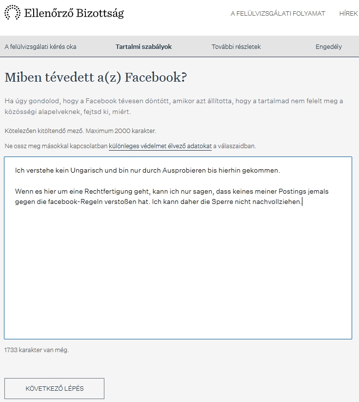 Und wieder keine Info, was denn nun genau angeblich gegen die fb-Regeln verstoßen haben soll, sondern stattdessen eine Rechtfertigungsseite, diesmal auf Ungarisch.