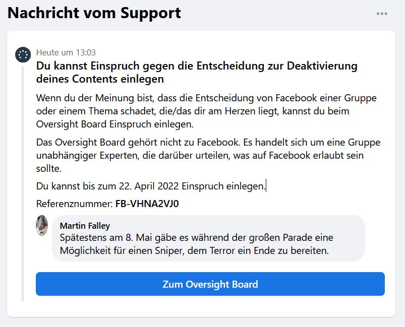 Da hätte ich doch zu gerne gewusst, was daran 'Hassrede' sein soll. Ist es vielleicht das Wort 'Russen'? Wenn ja, stellt sich mir die Frage warum und ist Mark Zuckerberg ein Putlin-Freund? Eine Erklärung wird jedenfalls, wie üblich, nicht geliefert. Man weiss also nicht, in welche facebook-/Revisor-Falle man demnächst stolpert und was alles Hassrede sein soll. Vielleicht veröffentlicht facebook ja irgendwann mal eine Liste mit Worten oder Formulierungen, die als Hassrede gelten, damit man sie meiden und ggf. anders formulieren kann. Aber da hoffe ich wohl zuviel.